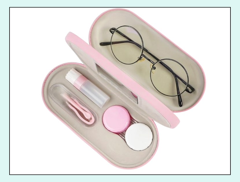 This compact case holds your glasses, contact lens case, solution, and tools in one place. It keeps everything organized and easy to find in your carry-on or handbag.