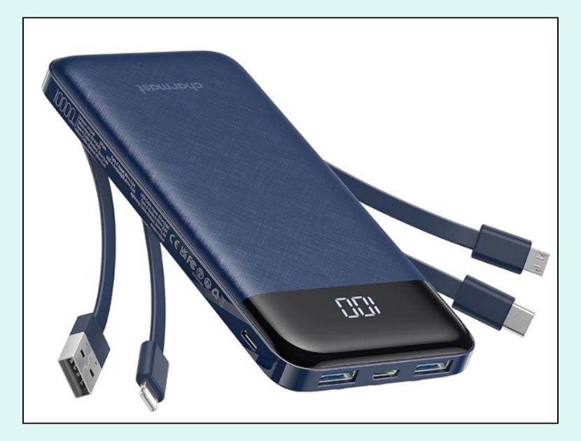 This slim power bank has built-in cables so you never have to search for the right cord. It can charge multiple devices at once and keeps your phone, tablet, or headphones going all day.