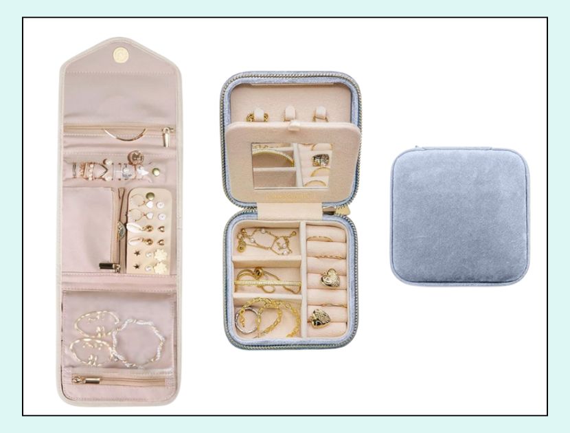 This foldable jewelry roll keeps rings, necklaces, earrings, and bracelets secure and separate. It folds flat so it’s easy to pack and has compartments that make it simple to find what you need.