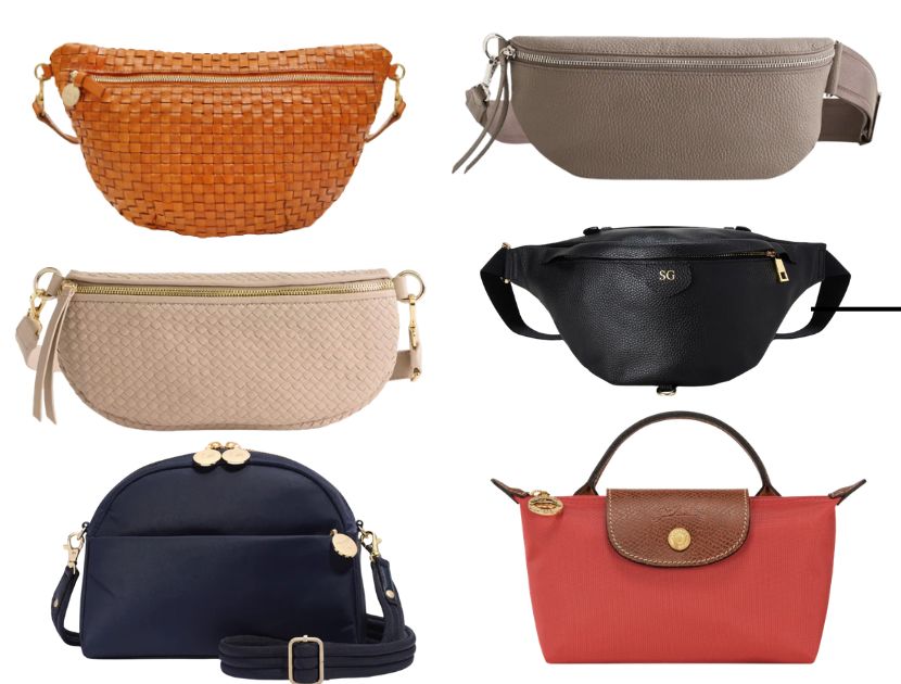 Clare V. Grande Fanny, $385 |Quince Italian Leather Handwoven Sling Bag, $94 | Lo & Sons Nouvelle Belt Bag, $158 | Quince Italian Pebble Leather Sling Bag, $74.00 | Etsy Personalized Bumbag, $95 | Longchamp Le Pliage Pouch, $100 plus Conversion Kit, $20