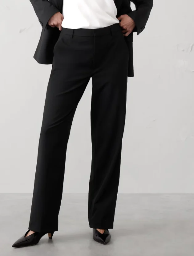 They sit high on the waist with a clean front and smooth fit through the hips and thighs, creating a long, flattering line. The structured fabric holds its shape beautifully, so they look just as good at the end of the day as they do when you first put them on.