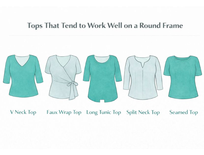 | Tops | Open necklines, vertical seams, wrap styles that skim, tunic lengths with structure, lightweight layering pieces | Creates vertical movement and avoids visual interruption through the midsection |