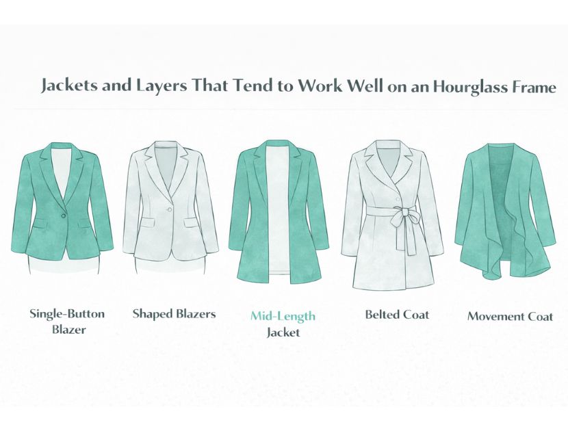 | Jackets | Single-button blazers, shaped jackets, belted or softly tailored layers | Supports the waist while keeping shoulders and hips balanced |