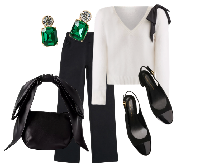 Our last look could go a million different places, from a bustling restaurant to your friends dining room table. This one is all about feeling elevated while being completely comfortable. We’re keeping our go to pants and adding this very pretty sweater from LOFT. I love the one shoulder bow. It is subtle, and the black and white contrast feels classic and refined.