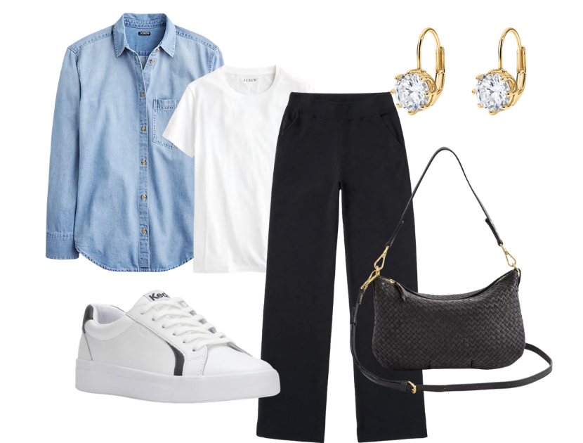 For sneakers, if you already own the black and white Vejas, wear them. If you want something less expensive, the Keds Pursuit Leather Lace Up is on sale for fifty dollars and a great alternative.