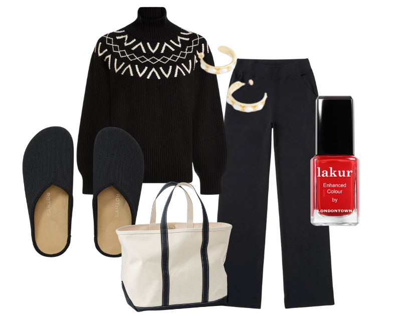We started with the black pull on pants, then added the Marcie Fair Isle Yoke Knit from Varely. It is a splurge, but it is one of those pieces that earns its keep if you live in a cold climate or spend any time skiing or at the mountains. The texture and weight make it feel special without trying and it’s great if you can’t wear wool.