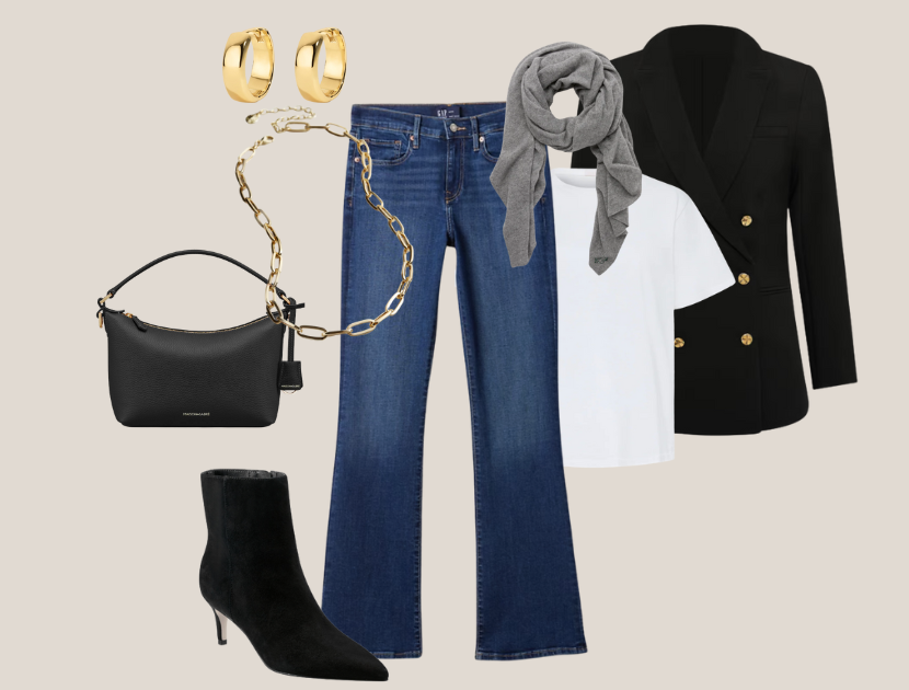 This final look is classic and modern, built with individual pieces that all have incredible versatility in your wardrobe. A bootcut jean and a blazer go together like peanut butter and jelly, and I know many of you already own the Diana Blazer from Tuckernuck, so here is a fresh way to wear it. If you want a lower priced option, we’re going back to Quince, theirs is in a scuba material so it’s stretchy but theirs is also $100.