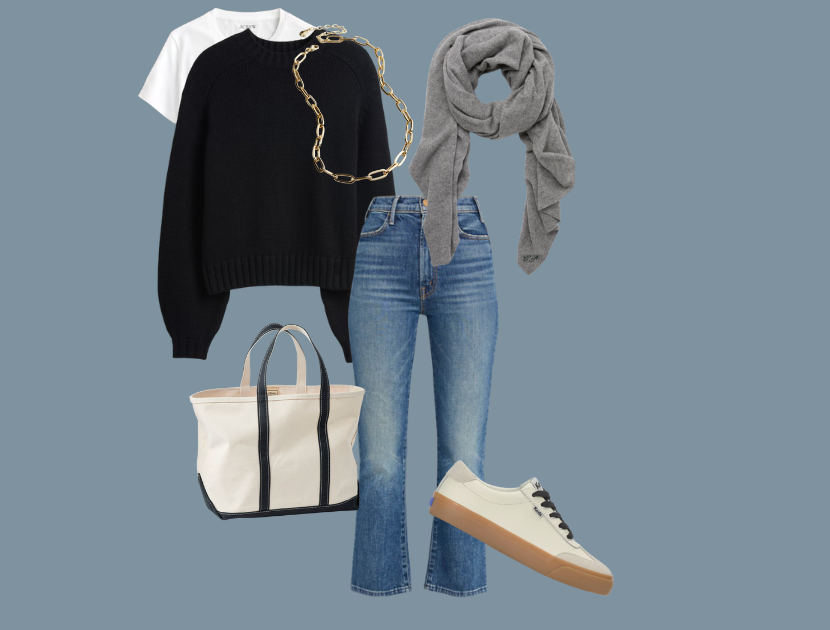 This outfit is built around simple pieces most of us already have on hand. Start with your ankle flares and layer a classic white tee under a black sweater.