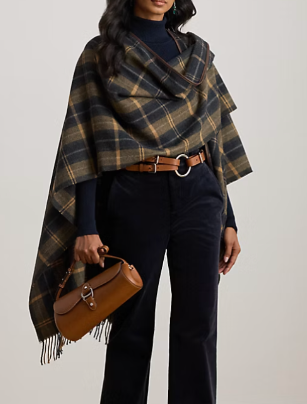 - Ralph Lauren Plaid Faux-Leather Trim Ruana ($128) — plaid, tailored, and timeless.