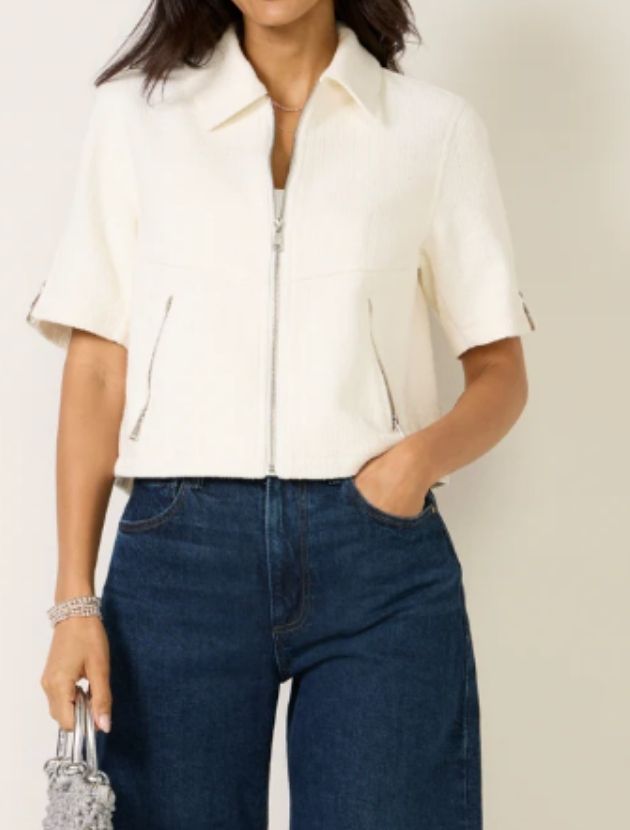 This is a standout layering piece that feels unique without being trendy. The tweed fabric gives it structure and polish, while the cropped cut and short sleeves keep it light and wearable, especially if you live in a warmer climate or want a layer that will not feel heavy.