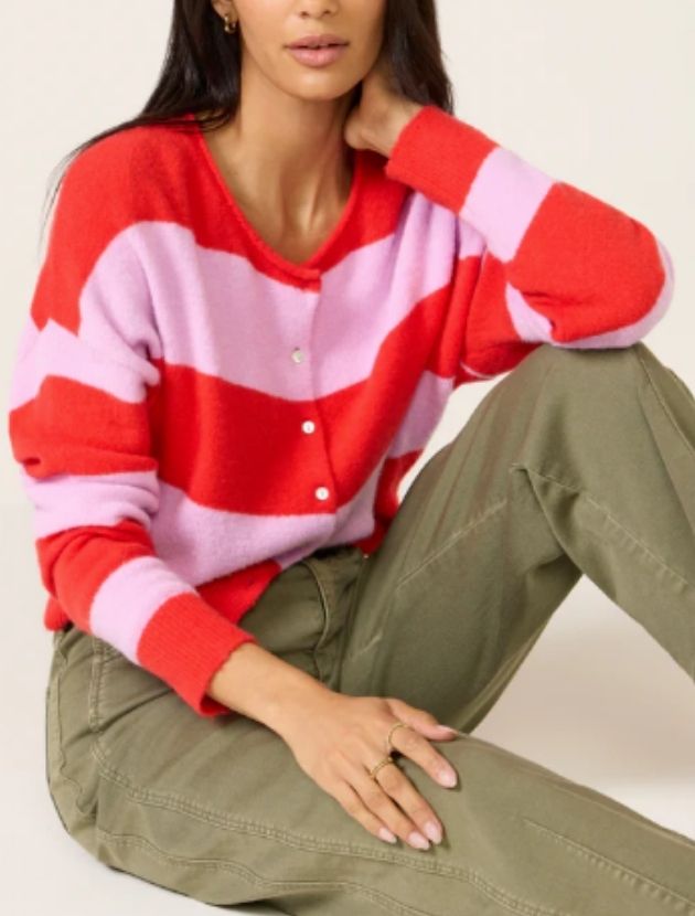 I am always a sucker for a pink-and-red combination, and this cardigan gets it right. The stripes feel fresh without being loud, and the relaxed shape makes it easy to wear casually without looking sloppy. It’s a great way to add color while still feeling polished.