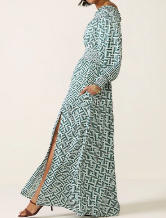 This is a bit of a splurge for a dress with limited wearability, but it’s the kind of piece that earns its keep if you have the right occasion. The off-the-shoulder neckline and fluid silhouette feel elegant without being overly formal, and the print makes it stand out without feeling trendy.