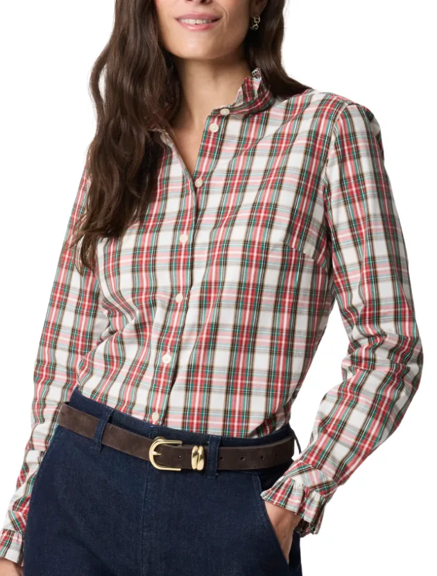 A classic button-up with a feminine twist. The subtle ruffle detail at the collar and cuffs adds just the right amount of polish, while the Ivory Rusted Red plaid feels seasonal without being overly holiday. It’s the kind of print that works all winter long. Pair it with coated jeans or a leather skirt for an easy outfit that looks pulled together but not fussy. Available in both classic and petite sizes.