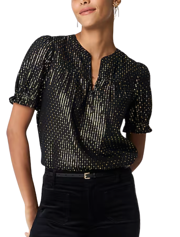 Festive, easy, and elegant, this top is an effortless way to elevate your holiday outfits without going over the top. The subtle metallic dots add just the right amount of sparkle, and the puff sleeves give it a feminine, flattering shape. Made from 90% cotton, it’s comfortable enough for all-day wear but polished enough for any celebration. Pair it with your favorite black pants, coated jeans, or a skirt for a simple but chic holiday look.