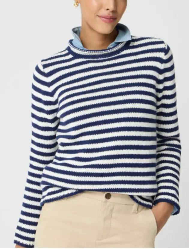 A clean, classic cotton sweater with a flattering mockneck and timeless stripe options. It looks great on its own with denim, or layered over a white tee or crisp collar shirt for a more styled feel. An easy piece that makes everyday outfits look intentional.