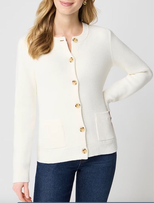 A structured cotton cardigan with a defined waist and clean, elevated shape. It looks especially sharp with straight-leg jeans and simple loafers, finished with classic everyday jewelry. Wear it layered over a tee or button-down, or slip it on over a cami and wear it fully buttoned as a top.