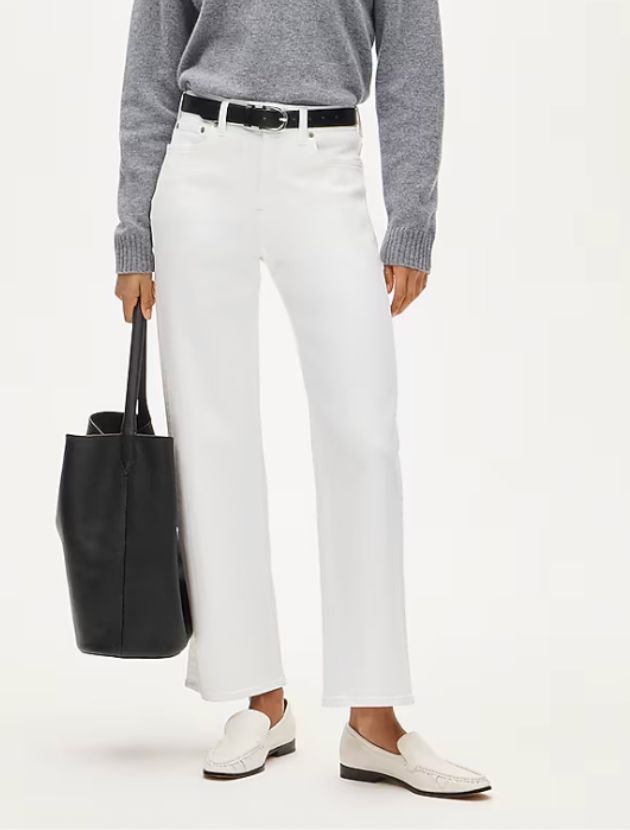 This is a really flattering take on a wide-leg jean. It’s fitted through the hips and thighs, then opens up just enough to feel modern without being overwhelming. The white denim is clean and structured, so it reads more polished than casual, and works just as well with a blazer as it does with a simple tee or lightweight sweater.
