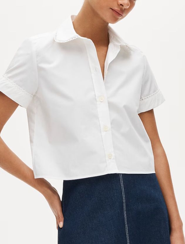 This is a nice alternative to a standard white button-down. The scallop detailing adds a subtle feminine touch, but it still reads clean and classic overall. It’s slightly cropped, so it works best with high-waisted bottoms to keep the proportions balanced. Easy with denim, trousers, or even a fuller skirt.