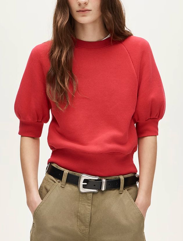 This is a very cute, elevated take on a short-sleeve sweatshirt. The puff sleeves dress it up just enough, while the terry keeps it casual and easy to wear. It’s the kind of piece that works when you want comfort but still want to look pulled together, especially with denim, chinos, or even a fuller skirt.