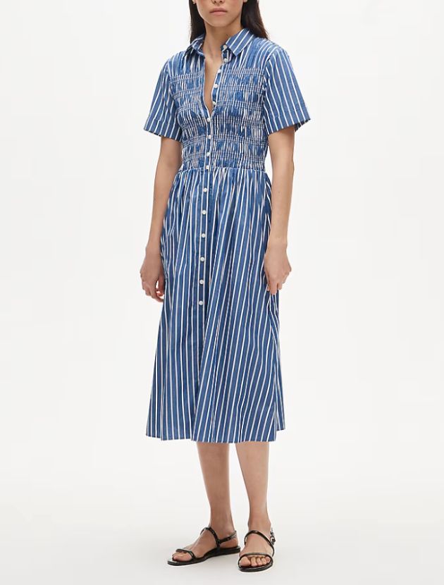 This is one of those easy dresses J.Crew does really well. The cotton poplin is crisp and holds its shape, and the smocked bodice gives it some definition without needing much else. The stripe keeps it classic, but the shape makes it feel a little more interesting than a standard shirt dress. It’s the kind of piece you can throw on and go, especially once the weather warms up.