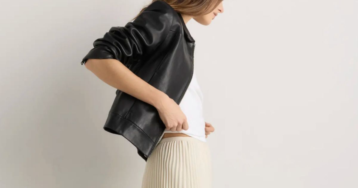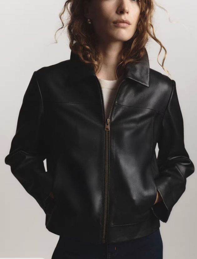 This is one of those “cropped” jackets, but it’s not really cropped. Crafted from 100% top grain sheep leather that is lightweight and soft, not stiff or heavy the way cheaper leather jackets feel, with strong shoulders, a classic collar, zip closure. It is the kind of piece that instantly sharpens whatever you put it over.