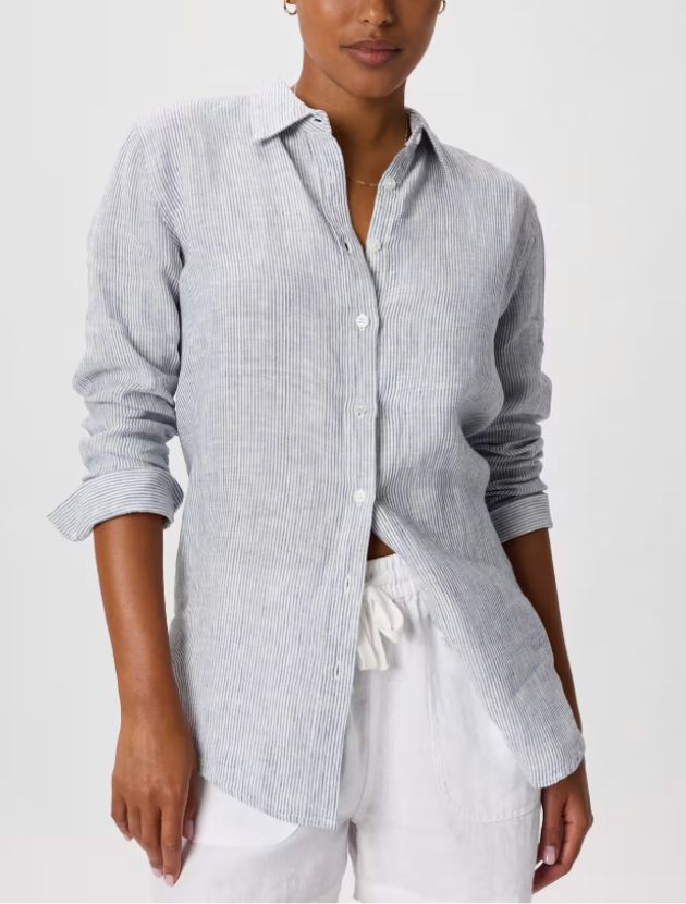 A classic, clean linen button-down with a relaxed silhouette that works tucked in, half-tucked, or worn open over a tank. The fabric is 100% European linen, so it breathes well and gets softer with every wash.