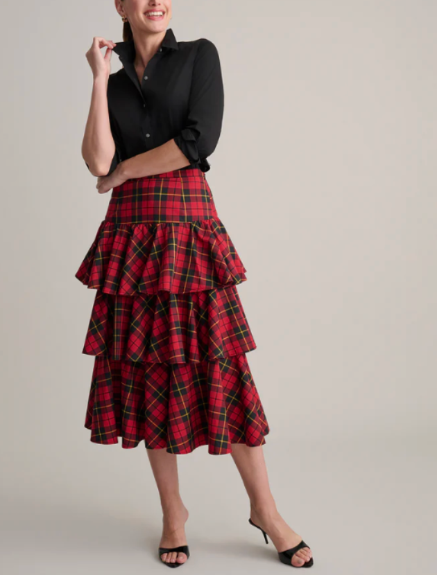 A classic tartan skirt with a playful twist. The tiered design gives it beautiful movement and makes it perfect for holiday events. I am wearing this to our annual Santa brunch with a black cashmere turtleneck and boots. It feels festive without being too precious and the length is flattering on many heights. I took the size 8 and the fit is spot on.