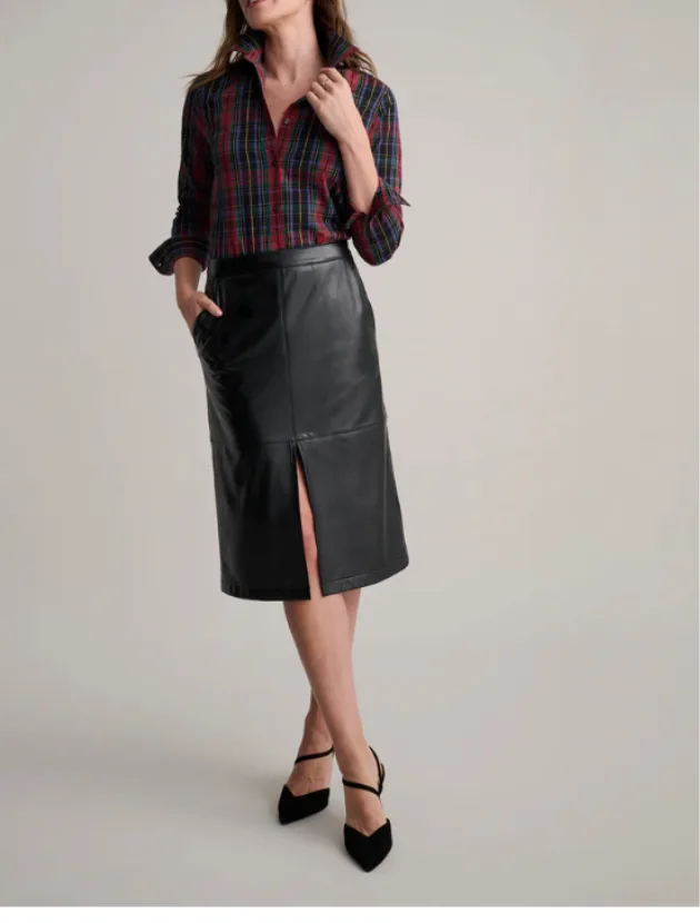 A sleek faux leather skirt that looks far more expensive than it is. The fit is smooth and flattering with a front slit that gives it an easy, modern feel. I have this in an Medium and it fits beautifully. You can wear it with a simple sweater for everyday or style it with a colorful shirt like the model for something more festive. It is chic, versatile and a great alternative to classic black pants this season and beyond.