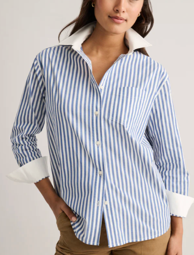A classic striped button down that is simple, crisp and easy to wear. The contrast collar and cuffs give it a tailored look without feeling fussy. I have this in a medium and the fit is relaxed in the best way. It works with jeans, trousers or half tucked into a skirt and is the kind of piece you reach for all year.