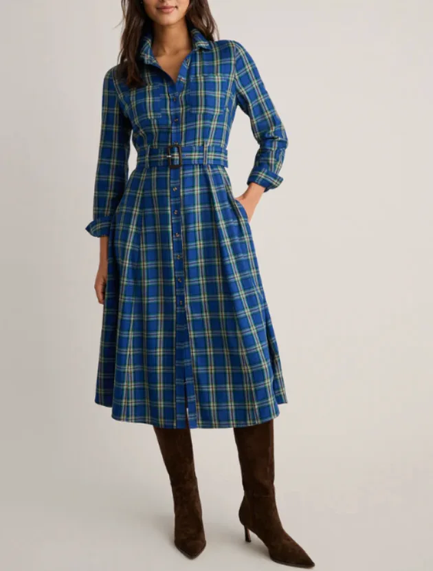 This was a bestseller for us and for good reason. It is soft, comfortable and fits beautifully. I wore it for our family pictures this year with boots just like the model and it photographed so well. The plaid is vibrant without being loud and the cut makes it incredibly wearable for everyday or casual holiday events. It is one of those dresses you put on and instantly feel pulled together.