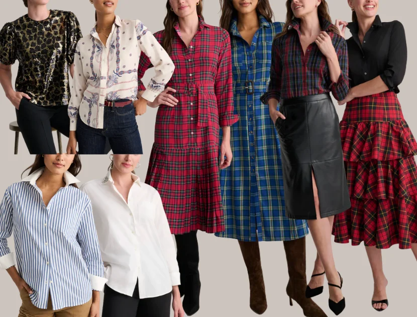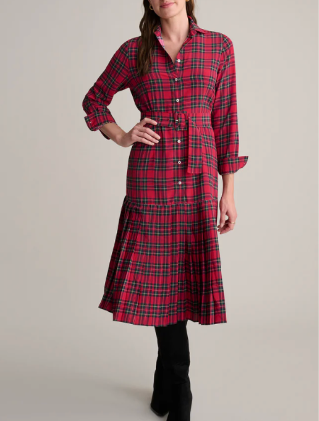 Another fun plaid option with a classic Stewart pattern and a pretty pleated detail at the hem. It has an easy fit, a flattering collar and the kind of movement that makes it great for holiday events, school concerts or casual gatherings. Wear it with tall boots like the model or with simple flats if you want something more relaxed. It is festive without feeling overdone.