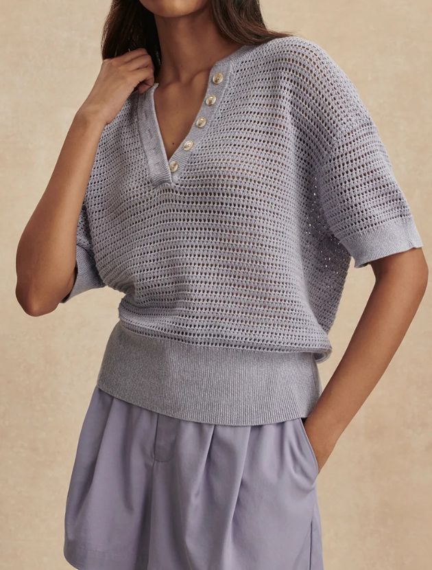 This is 100% cotton and the most spring-forward piece in the roundup. It is a contemporary polo in a lightweight open knit with a deep V-neck, dropped shoulders, and short sleeves. The open mesh fabric makes it genuinely breathable and easy to wear as the weather warms up.