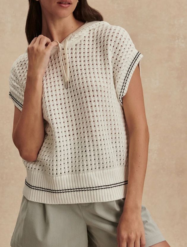 This one is different and that is why I love it. A sleeveless knit hoodie in 100% cotton with a pointelle stitch texture and adjustable drawcord hood. The open knit makes it feel fresh rather than heavy, and it is a genuinely unexpected layering piece for spring.