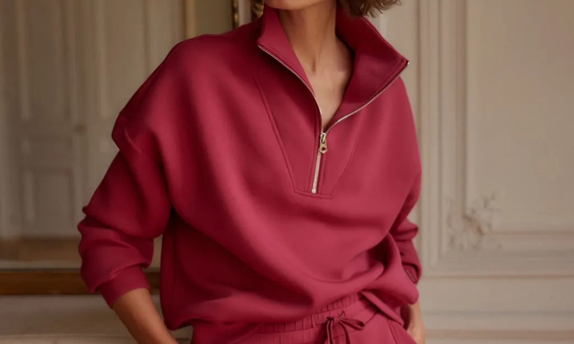 This is the piece I recommend first and the one I wear the most. It is an oversized half-zip in DoubleSoft fabric with a panelled neckline, dropped shoulders, and deep cuffs with a banded hem. The half-zip is what elevates it above a standard pullover. It looks considered.